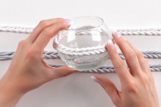 5. Nyomjuk vízszintesen az üveg mécsestartóra a kötött hatású csíkokat, ahol összeérnek, a felesleget vágjuk le. Az egyik színt alul, a másik színt felül helyezzük el.